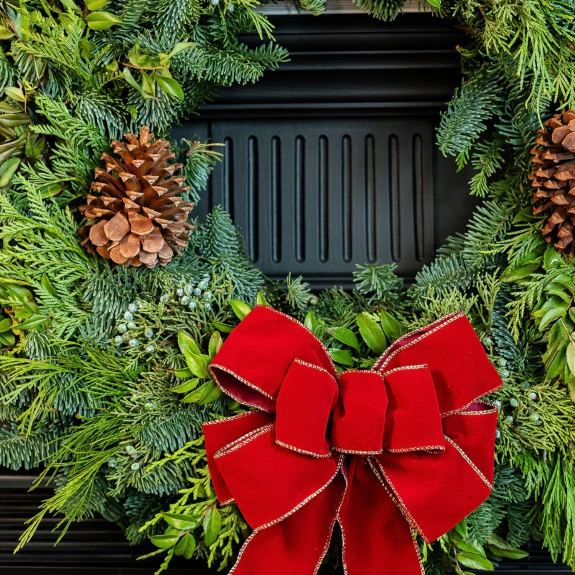 Fresh Noble Fir, Incense Cedar, Juniper, Pinecones and a Festive Red Bow trimmed in gold.